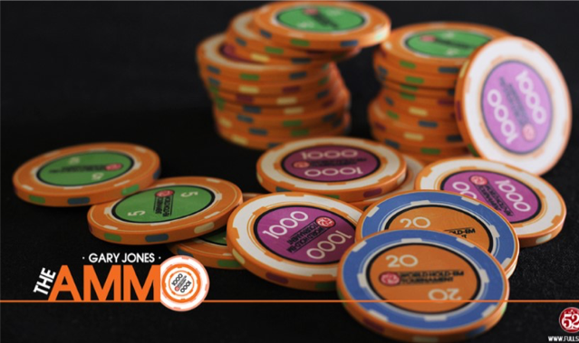 Gary Jones’ “The Ammo” contains 3 different colour and different value casino-type poker chips. The 3 different values are 5