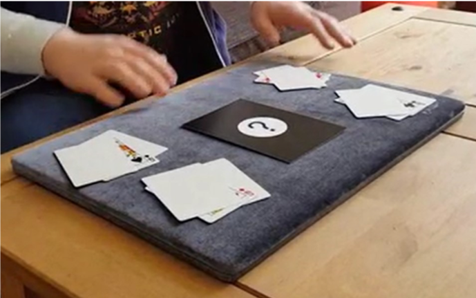 The performer divides a deck of cards into 2 halves. These are not playing cards. From the first half of