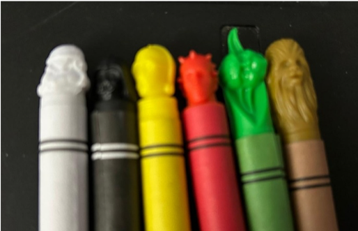 For example, at the opposite end of the tip of the green crayon is a carving of the head of Yoda, black has Darth Vader, yellow is C-3PO, white is Stormtrooper, red is Darth Maul, and brown is Chewbacca. You can see that each of the Star Wars characters is matched as closely as possible to the colour of the character itself.