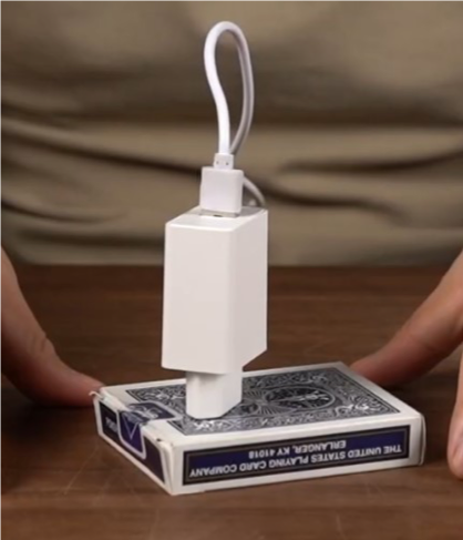 This is best used in conjunction with an effect involving the spectator’s or your mobile phone. For example, a phone app. Before the phone is used, say that you want to check if the phone is charged to at least a certain battery level. Connect the charger to the mobile and realise it does not work. The charger itself needs to be charged first. You look around and there are no electrical sockets nearby. Take out a small whiteboard and proceed to draw a socket on the whiteboard with the whiteboard pen. Magic is all about illusion and using the mind to imagine. Plug in the charger into the drawn socket. The 2 pins of thecharger appear to go into the drawing of the socket. Immediately, everybody can see that the mobile phone is charging, as the charging level is shown on the screen of the phone. “Oh, this level is enough.” You then proceed to disconnect everything and erase the drawing of the socket with a cloth or a whiteboard eraser. You then continue and perform the magic trick using the mobile phone.- If you are performing close-up or a card trick, gimmick the card box of your playing card. “Plug” your charger on top of your card box and proceed to charge your mobile phone.