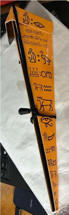 In effect, the performer invites a lady to assist him. He shows the lady a tall yellow pyramid shape cardboard container that contains hieroglyphic symbols. He unfolds the container and show that there is nothing side except the black colour interior. The container is closed and given to the lady to hold.