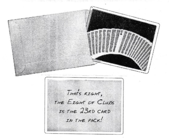 The performer says the 8 of clubs is exactly the 23rd position from the top of the deck.  However, from the photograph, the top portion of the deck is outside the frame of the photograph.  To prove that it is exactly at the 23rd position from the top of the deck, the performer turns over the photograph.  He has written, on the back of the photograph the following message: “That’s right, the eight of clubs is the 23rd card in the pack!”